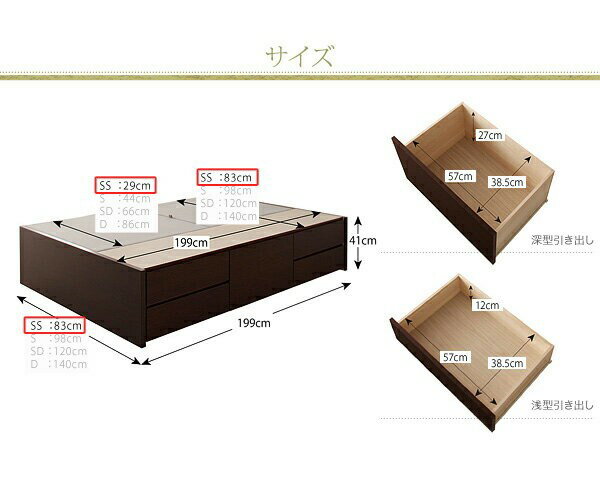 商品名セミシングルベッド 一人暮らし コンパクト SS 小さい ミニ 省スペース マットレス付き チェストベッド ミドル ベッド下収納 引き出し付き 大容量 ヘッドレス ヘッドボードなし 北欧 おしゃれ モダン アンティーク商品バリエーション要組立 マルチラススーパースプリングマットレス付き セミシングル全バリエーション商品説明ベッド本体【本体最大外寸】セミシングル:(約)幅83×長さ199×高さ41cmシングル:(約)幅98×長さ199×高さ41cmセミダブル:(約)幅120×長さ199×高さ41cmダブル:(約)幅140×長さ199×高さ41cm床面までの高さ:41cm【収納部有効内寸】引き出し:浅型引き出し(4杯):(約)幅57×奥行き38.5×深さ12cm深型引き出し(1杯):(約)幅57×奥行き38.5×深さ27cm長物収納:(セミシングル):(約)幅29×長さ193×深さ36cm(シングル) :(約)幅44×長さ193×深さ36cm(セミダブル) :(約)幅66×長さ193×深さ36cm(ダブル) :(約)幅86×長さ193×深さ36cm【材質】本体はMDFプリント、引出しは桐集成材【生産国】フレーム:日本【カラー】//【商品重量】セミシングル:(約)59kgシングル:(約)63kgセミダブル:(約)67kgダブル:(約)71kg【耐荷重】約180kg(全サイズ共通)【梱包数】5梱包【梱包サイズ・重量】セミシングル:(約)196×44×56cm・52kg、35×98×10cm・8kg、88×4.5×43cm・4kg、88×4.5×43cm・4kg、35x2x100cm・2kgシングル :(約)196×44×56cm・52kg、50×98×10cm・8kg、100×4.5×43cm・4kg、100×4.5×43cm・4kg、50x2x100cm・3kgセミダブル :(約)196×44×56cm・52kg、72×98×10cm・10kg、123×4.5×43cm・5kg、123×4.5×43cm・5kg、73x2x100cm・4kgダブル :(約)196×44×56cm・52kg、92×98×10cm・12kg、143×4.5×43cm・6kg、143×4.5×43cm・6kg、92x2.5x100cm・5kg※本製品は、組み立て品です。