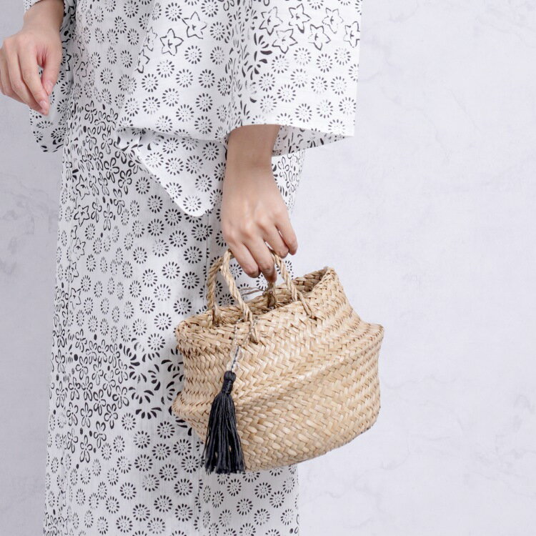 かごバッグ カゴバッグ シーグラス ラウンド バッグ レディース タッセル ナチュラル 伝統技法 伝統工芸 ビーズ クリア タッセル付 夏 浴衣 トレンド ベージュ トートバッグ ハンドバッグ ハンドメイド