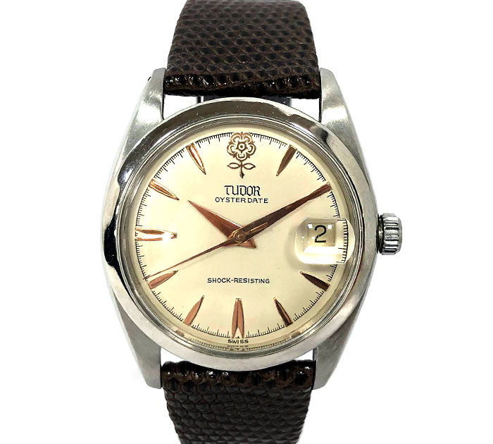 【TUDOR】チュードル オイスターデイト Ref.7962 デカ薔薇 手巻き ロレックスケース 竜頭60's ステンレス×レザー OH済 1965年製 アンティーク 時計 RM3296【中古】