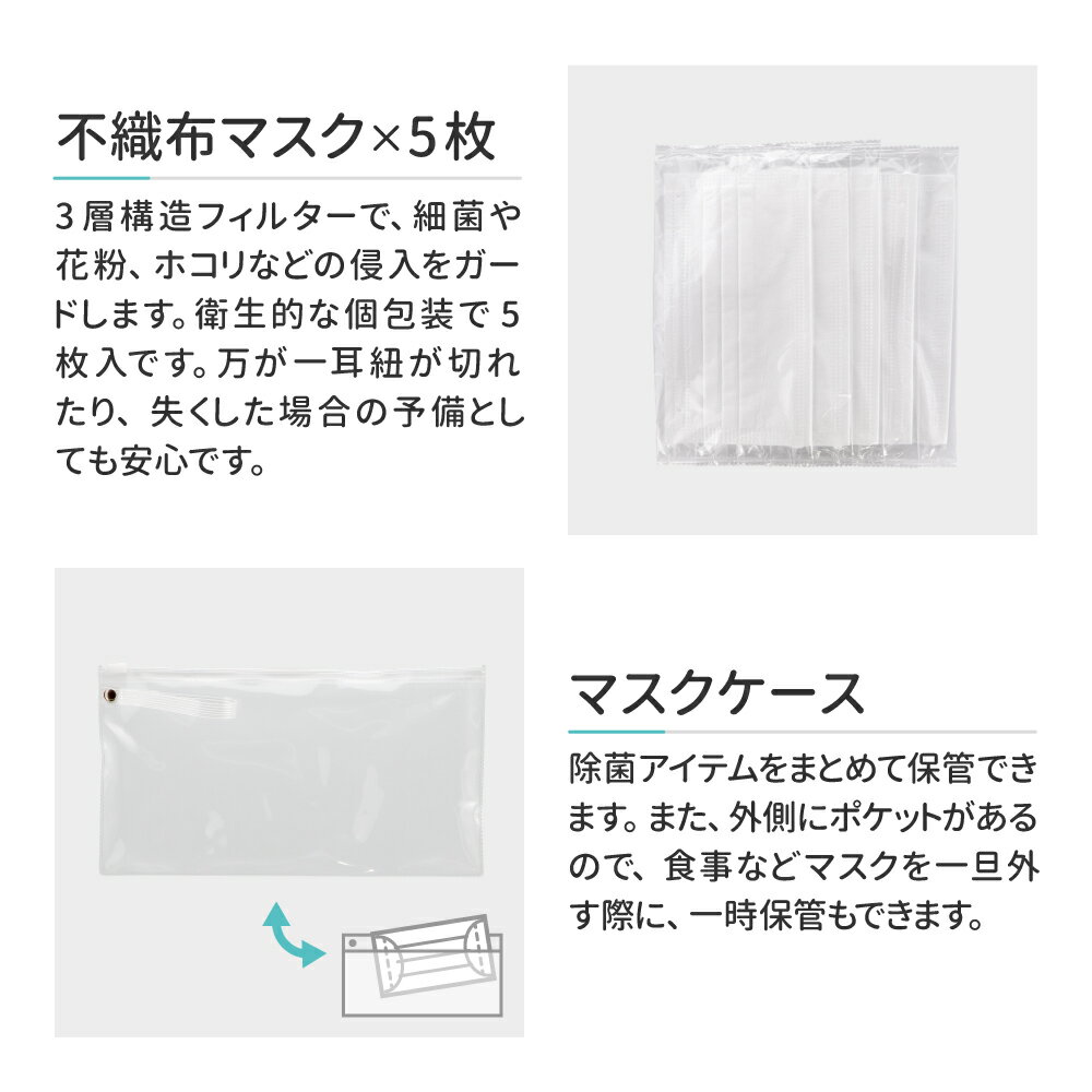 〈セット内容〉 ■不織布マスク 5枚入 ・細菌/花粉/ほこり等の侵入をガードする3層構造フィルター ・プリーツ加工で顔にやさしくフィットし、息苦しさを軽減 ・柔らかい「平ゴム」耳ひもで耳が痛くなりにくい ・1枚ずつ個包装になっているので清潔に持ち運べます ■ポケット付きマスクケース ・マスクの一時収納にも便利なクリアケース。
